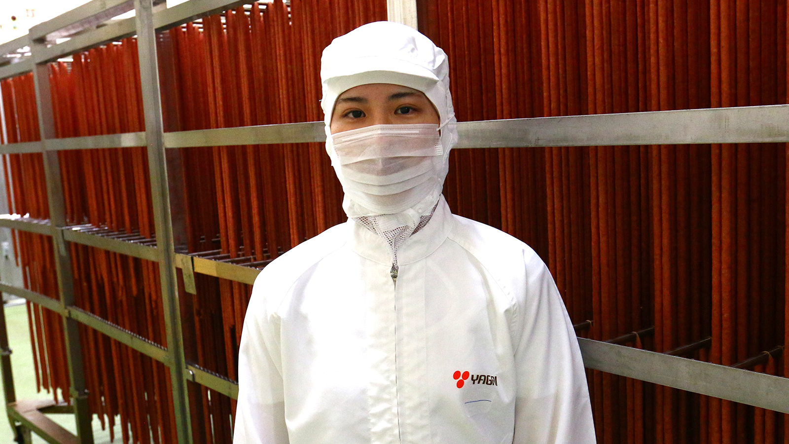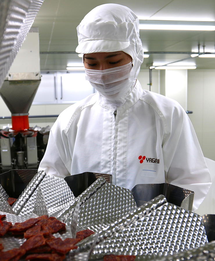 私が所属しているスケール班では、サラミ・カルパスの包装作業が主な仕事となっています。包装作業では、サラミ・カルパスの検品や機械を用いた計量、製品検査などが行われます。7つの工程で成り立っており、工程ごとに作業者が配置されます。作業中は、包装不良や異物などに気づく注意力が必要で、正確さと責任感が求められます。現在は、ライン管理という業務も担当しています。ライン管理では、生産業務が円滑に行えるように使用するサラミ・カルパスや資材関係の準備・運搬などを行います。お客様に安心・安全な商品を届けるために、一つ一つの作業に責任を持ち、日々の業務に取り組んでいます。